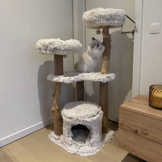 Für Katzen ist ein Kratzbaum sehr wichtig, um ihre Krallen zu pflegen und ihr Revier zu markieren. Der stilvolle EBI Marseille ist aus Naturholz gefertigt und mit weichem Langplüsch ausgestattet. Der lange Plüsch macht die Liegeflächen extra weich für Ihre Katze. Die beiden bequemen Körbe auf der Oberseite können sowohl als Sicht- als auch als Schlafplätze dienen. Darüber hinaus verfügt der Kratzbaum über ein Katzenhaus, das sich ideal zum Verstecken und Ausruhen eignet. Die vier robusten Kratzbäume sind mit weicher, reißfester Jute umwickelt. Und zu guter Letzt gibt es noch zwei Bälle mit Glöckchen, mit denen Ihre Katze viel Spaß haben wird! Haftungsausschluss! Da die Kratzbäume aus Naturholz gefertigt sind, ist jeder Kratzbaum ein Unikat. Die Stange kann daher leicht von der Abbildung abweichen.