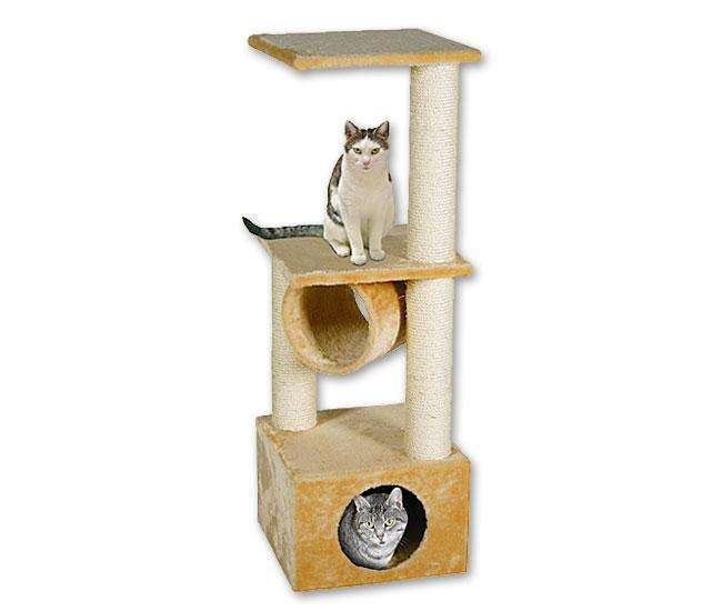 Die Platten und die Höhle sind mit Plüsch bezogen und bieten so bequeme Schlafplätze, während die Sisal-Kratzstämme für eine gute Möglichkeit zum Krallenschärfen sorgen. Die Röhre besteht komplett aus Plüsch.