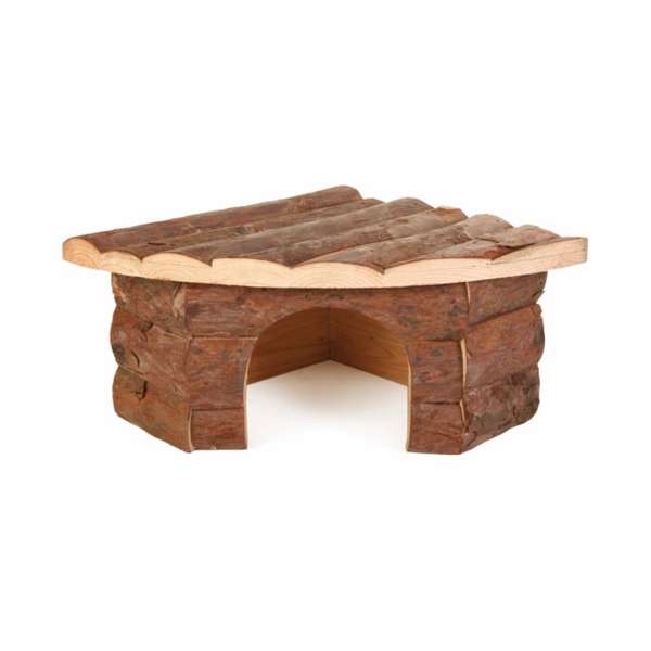 Das Eckhaus Jesper aus Naturholz kann in jedem Käfig Platz sparend aufgestellt werden. Das Flachdach bietet Platz zum Heraufspringen oder -klettern. Diese Größe eignet sich ideal für Zwerghamster, Mäuse und ähnlich große Tiere.