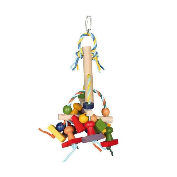 Vogelspielzeug für Großsittiche und Papageien aus bunten Holzelementen in verschiedensten Formen und gedrehten bunten Papierbändern. Die Befestigung im Käfig erfolgt ganz einfach über den montierten Haken.